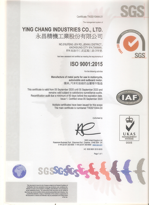 Yingchang Precision Machinery Industry Co., Ltd. was established in 1952. For nearly 70 years since its establishment, it has been adhering to the beliefs of quality first, customer satisfaction, and punctual delivery. It specializes in motor vehicle parts. YAMAHA (Taiwan Yamaha Motors), through YAMAHA Taiwan, sells high-quality parts and components to Japanese parent factories and locations in Europe and the United States, including heavy-duty motorcycles, ATVs, golf carts, snowmobiles, jet skis, electric wheelchairs, etc. Parts and components have been recognized by customers for decades and have won many awards. In 1998, they introduced ISO9001 certification, insisted on upholding technical expertise, and continued to provide customers with excellent quality, 100% delivery accuracy and the fastest and most complete service.